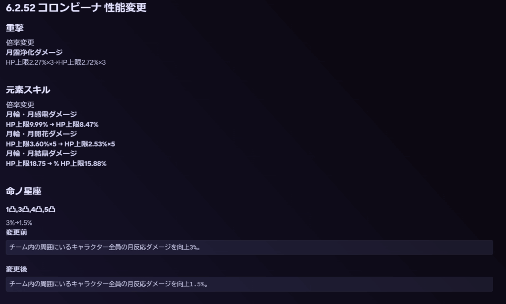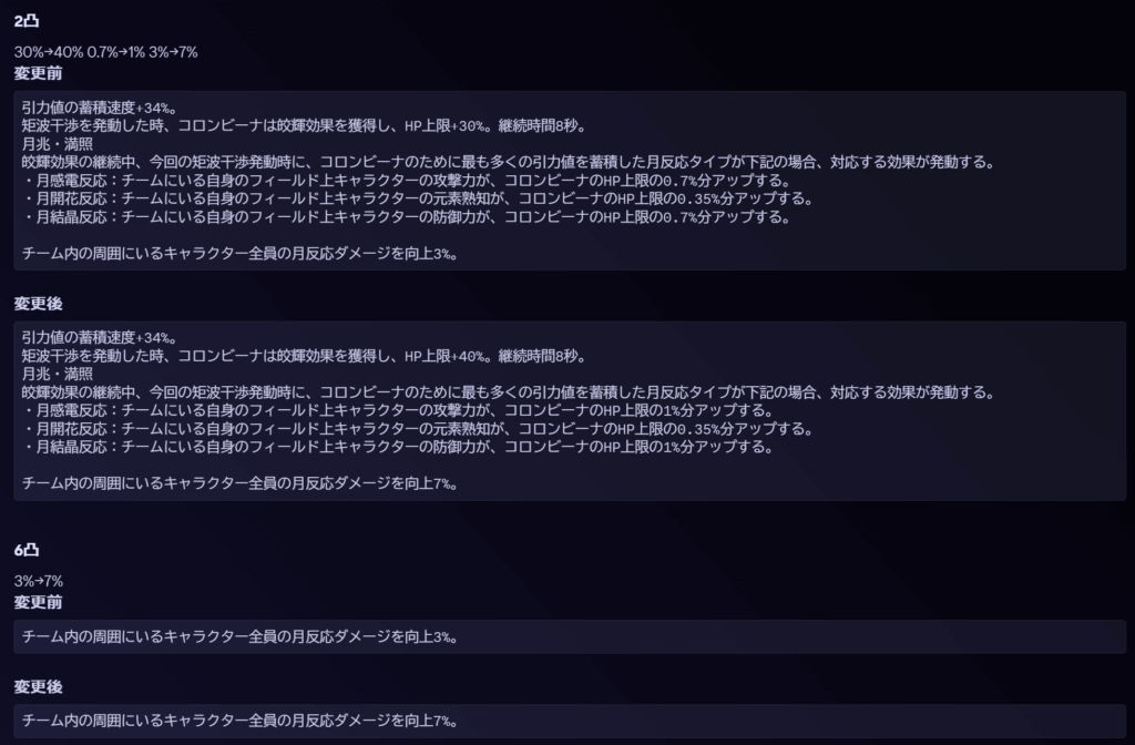 | 月が呼んだ狂気 | 矩形波干渉を発動すると、コロンビーナは誘月効果を獲得し、自身の会心率+5%。継続時間10秒。この効果は最大3重まで重ねられる。 |