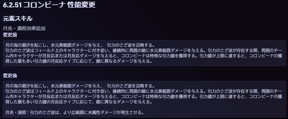 | 元素スキル万古の潮汐発動時、引力の干渉に等しい効果を直ちに1回発動する。この効果は15秒毎に1回のみ発動可能。 月兆・満輝 引力の干渉発動時、コロンビーナが最も多く引力値を溜めた月反応の種類に応じて、それぞれ下記の効果を獲得する。 ・月感電反応:フィールド上にいるチーム内の自身キャラクターの元素エネルギーを6回復する。 ・月開花反応:フィールド上にいるチーム内の自身キャラクターの中断耐性をアップさせる。継続時間8秒。 ・月結晶反応:雨海の盾を生成する。ダメージ吸収量はコロンビーナのHP上限の12%にあたり、水元素ダメージに対しては250%の吸収効果がある。継続時間8秒。 周囲のチーム全員が与える月反応のダメージを1.5%引き上げる。 | |