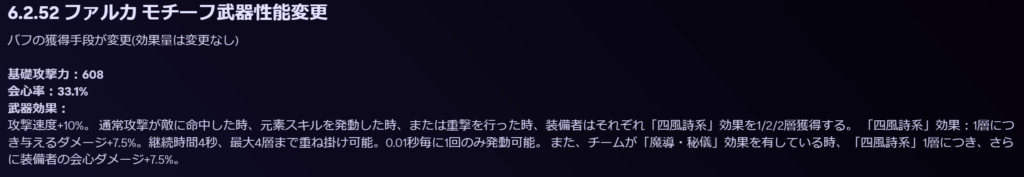 効果攻撃速度+10%。 通常攻撃が敵に命中した時、元素スキルを発動した時、または重撃を行った時、装備者はそれぞれ「四風詩系」効果を1/2/2層獲得する。 「四風詩系」効果:1層につき与えるダメージ+7.5/9.5/11.5/13.5/15.5%。継続時間4秒、最大4層まで重ね掛け可能。0.01秒毎に1回のみ発動可能。 また、チームが「魔導・秘儀」効果を有している時、「四風詩系」1層につき、さらに装備者の会心ダメージ+7.5/9.5/11.5/13.5/15.5%。